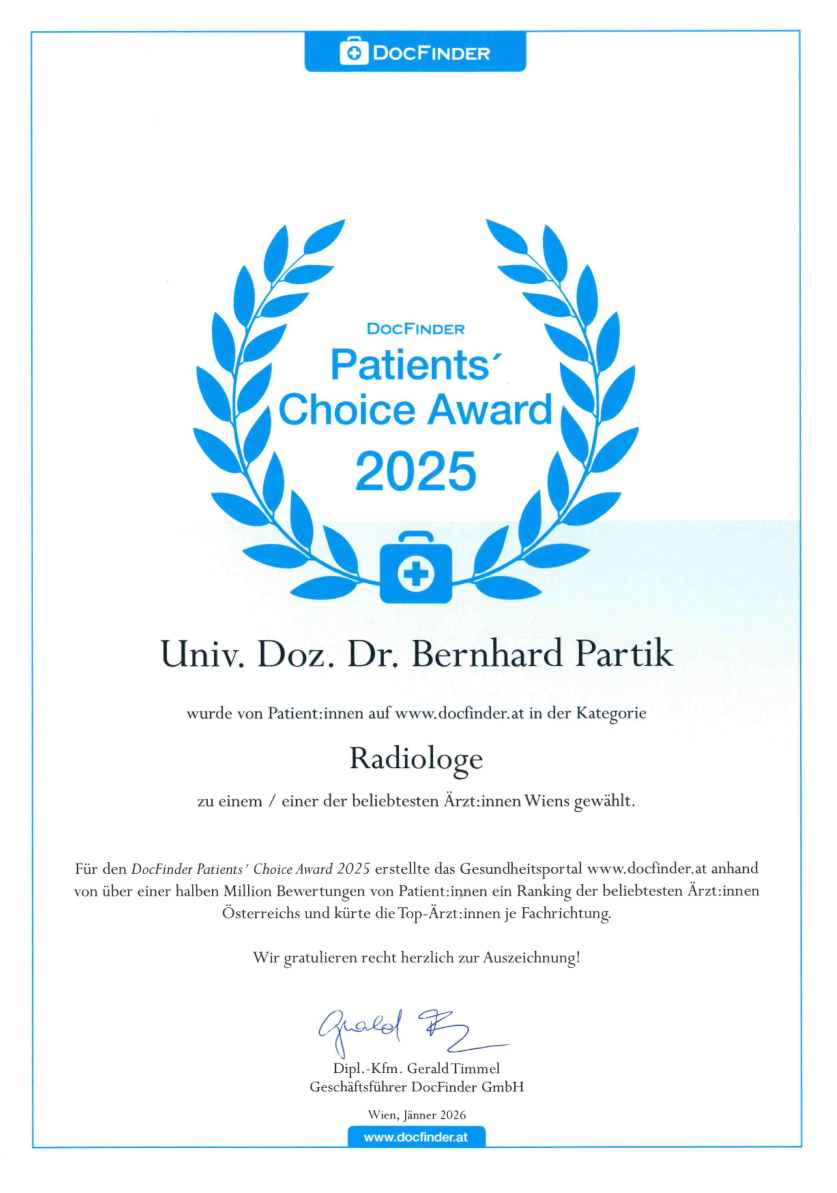 Wir dürfen mit Stolz verkünden, dass unser Geschäftsführer Univ.Doz.Dr. Bernhard Partik zu den beliebtesten Ärzten der Fachrichtung Radiologie 2025 gehört.